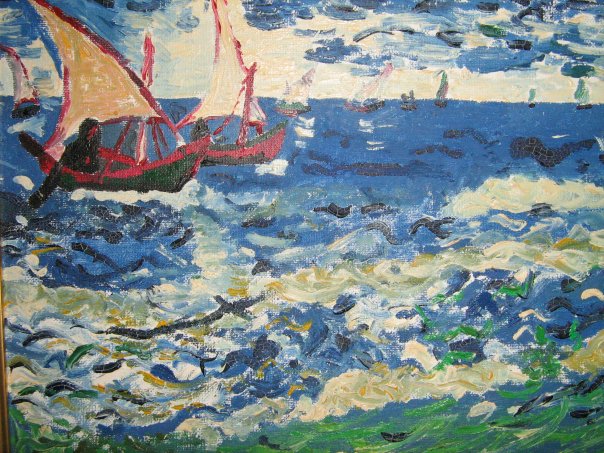 Reproduction of a painting by the famous Dutch artist Vincent van Gogh, who painted boats at sea.